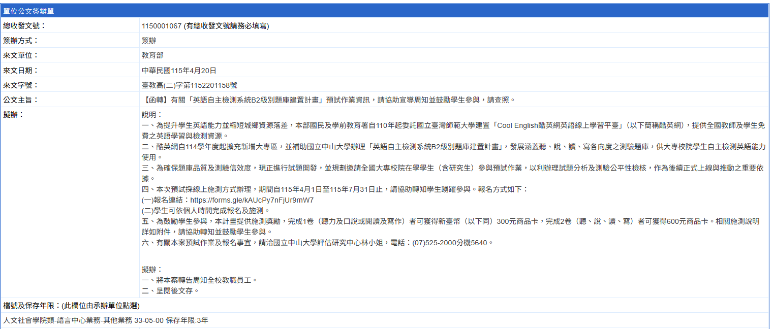 有關「英語自主檢測系統B2級別題庫建置計畫」預試作業資訊,歡迎踴躍報名參加。